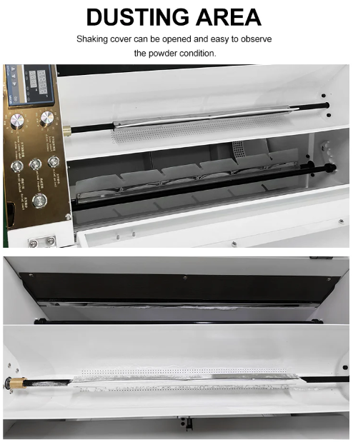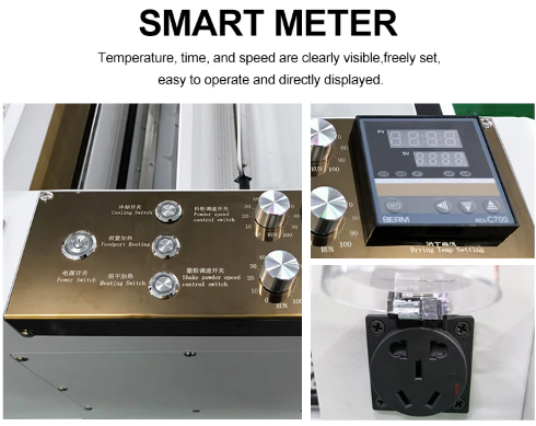 - Control Panel: Automatic/Manual Control, Shaking Powder Speed Control, Dusting Powder TimeControl, Mesh Belt Air Suction Speed Control, Mesh Belt Speed Control, Mesh BeltDirection Control, Curing Temperature Control, Front Heat Transfer PlateTemperature Control, Cooling Down Fan Control.