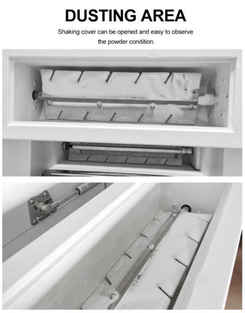 - Control Panel: Automatic/Manual Control, Shaking Powder Speed Control, Dusting Powder TimeControl, Mesh Belt Air Suction Speed Control, Mesh Belt Speed Control, Mesh BeltDirection Control, Curing Temperature Control, Front Heat Transfer PlateTemperature Control, Cooling Down Fan Control.
